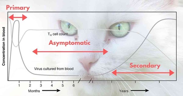 Figura 2 – Fases do desenvolvimentos da Imunodeficiência Felina (FIV). Os sintomas da FIV podem variar bastante e podem não aparecer imediatamente após a infeção. A doença geralmente progride em estágios